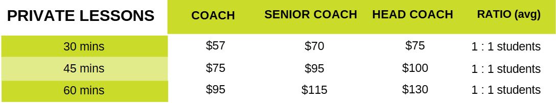 Our coaches, courts, and customers are booked solidly from 3:30 pm – 7:30 pm on weeknights and on Saturday mornings. Our coaches need to be available to deliver group lessons in our junior and adult programs during peak times. This means it is difficult to secure a private lesson spot with our team.