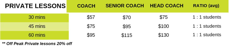 Our coaches, courts, and customers are booked solidly from 3:30 pm – 7:30 pm on weeknights and on Saturday mornings. Our coaches need to be available to deliver group lessons in our junior and adult programs during peak times. This means it is difficult to secure a private lesson spot with our team.